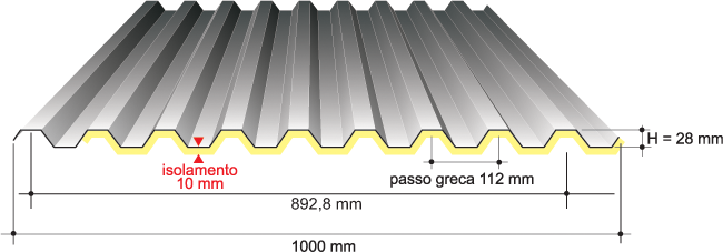 ISOGREK h 28 è realizzato mediante un processo produttivo in continuo, attraverso l’impiego di tecnologie altamente innovative che consentono di avere una densità di poliuretano superiore ad un semplice pannello monolamiera. Questa caratteristica, abbinata alla geometria a 9 greche della sezione, rende il prodotto altamente resistente ai carichi concentrati.